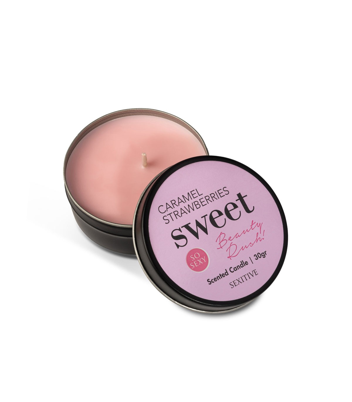 La vela para masajes de Sexitive fragancia caramelo de frutilla, están formuladas con aceite de soja y jojoba, aceites naturales y vitaminas que suavizan y nutren la piel.