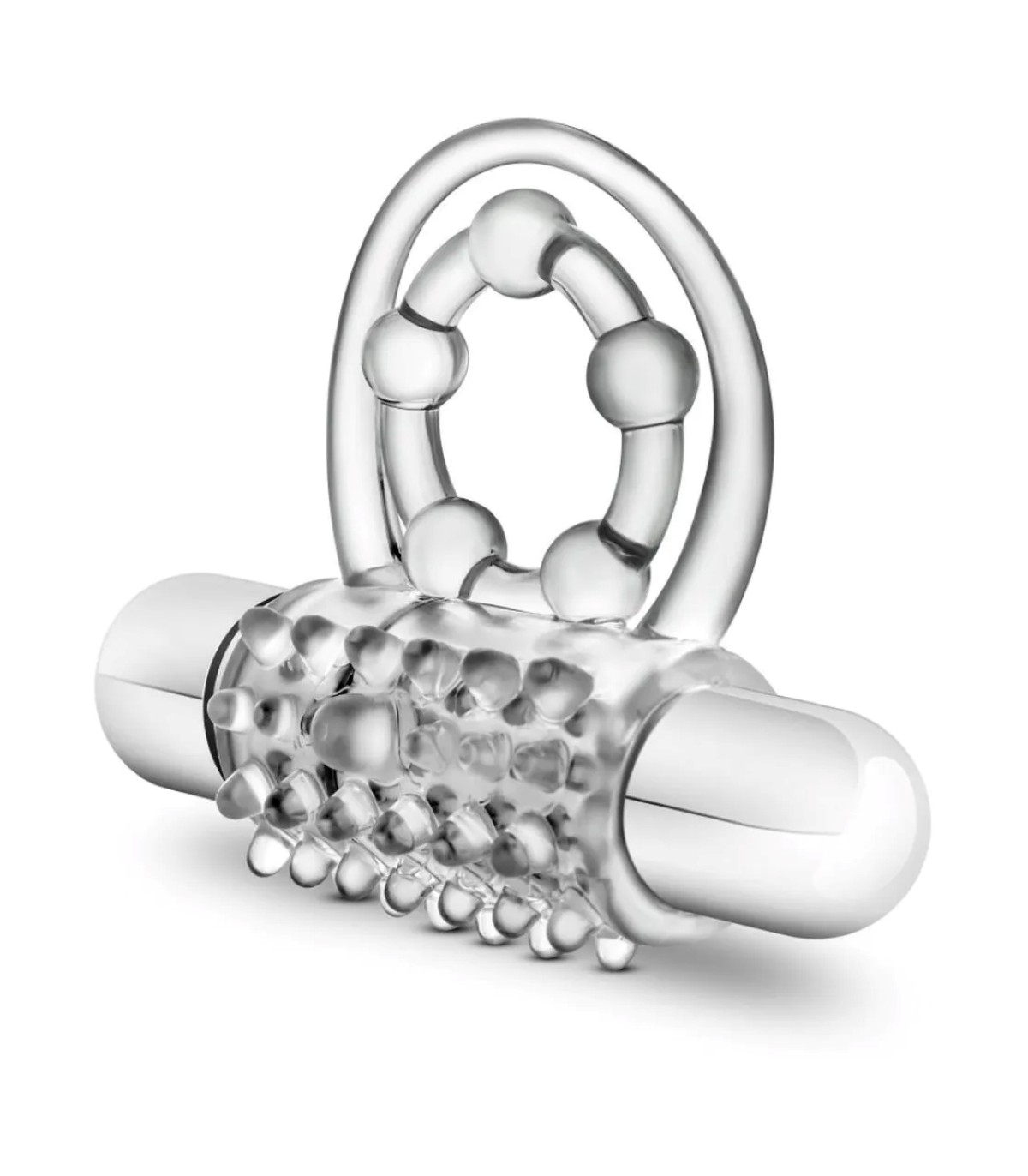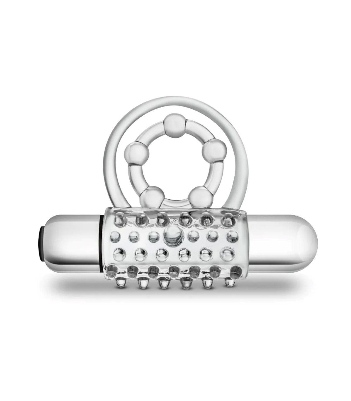 El vibrador estimula el clítoris durante la penetración al mismo tiempo su doble anillo ajusta la base del pene manteniendo la erección por más tiempo y los testículos.