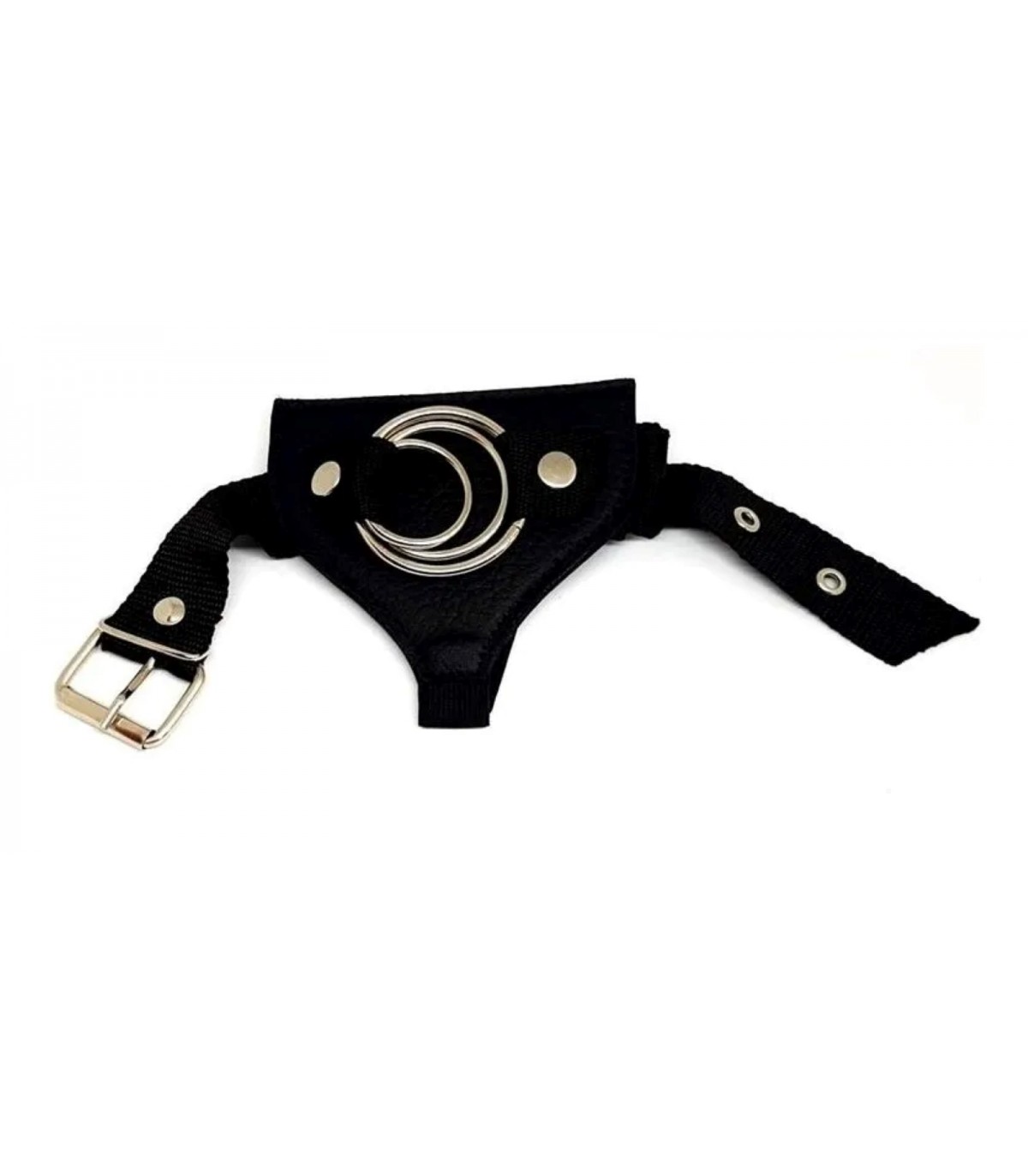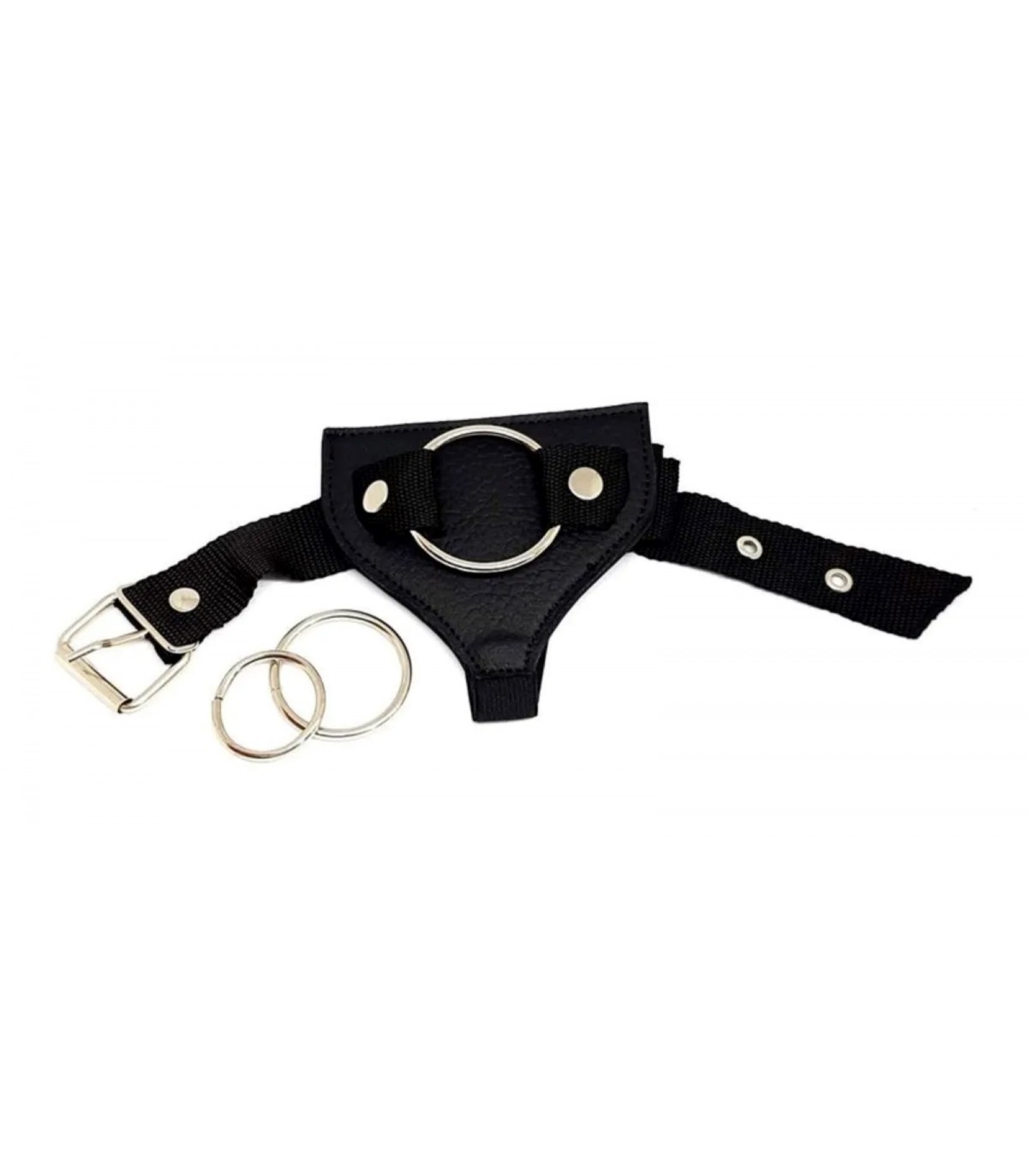 Arnés de cuero con 3 diferentes diámetros para distintas medidas de dildos. Cintura regulable y tiro elastizado.