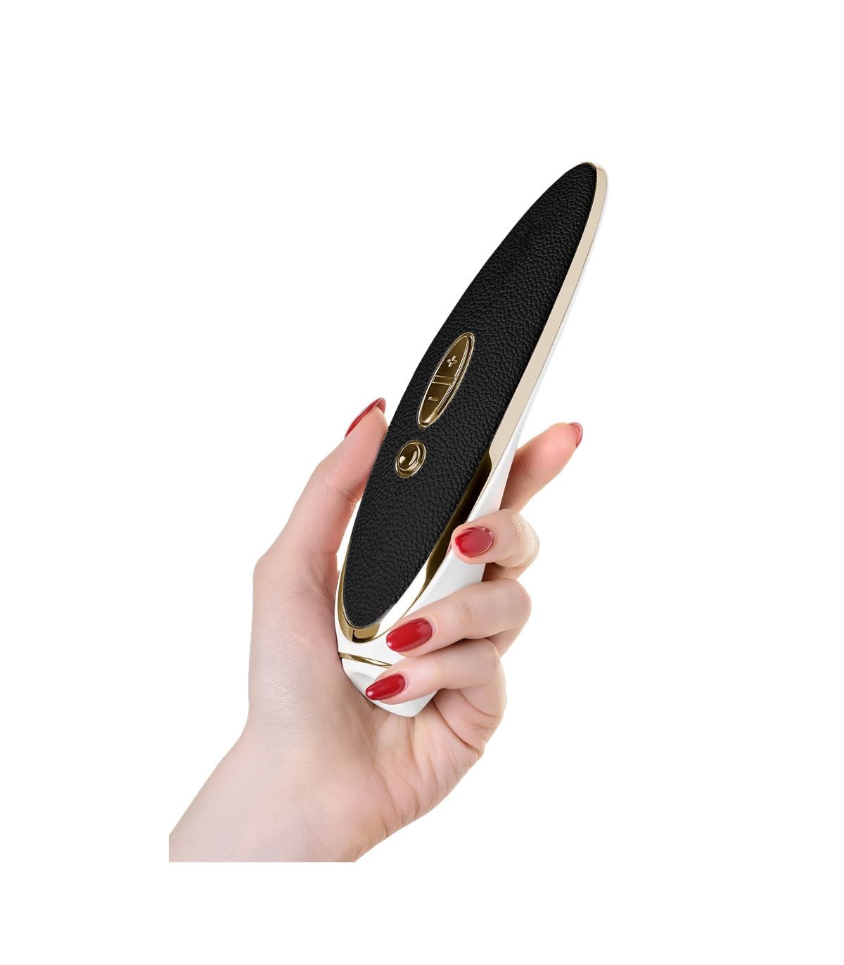 Esta joya de lujo está diseñada con preciosos detalles. Con materiales como cuero negro, detalles dorados y silicona suave de grado médico, este juguete ofrece un toque refinado para estimulación del clítoris.