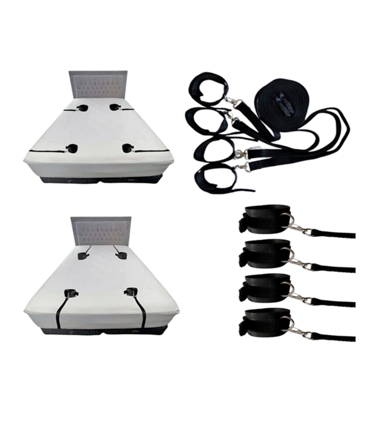 Para vivir un intenso y erótico juego de sumisión y dominación. Este inmovilizador esta compuesto por esposas, tobilleras y correas regulables para pasar por debajo del colchón.