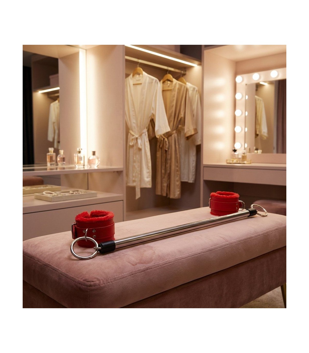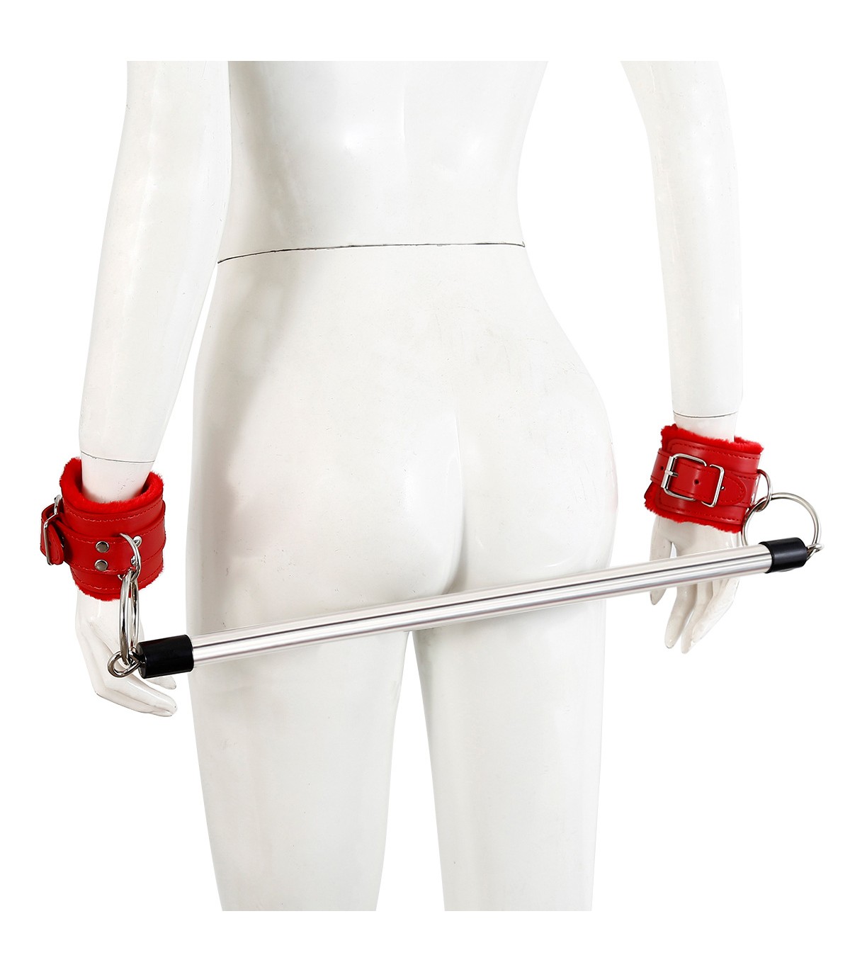 La barra esta confeccionada de metal, ,mientras que las esposas son de eco cuero rojas con peluche en su interior.