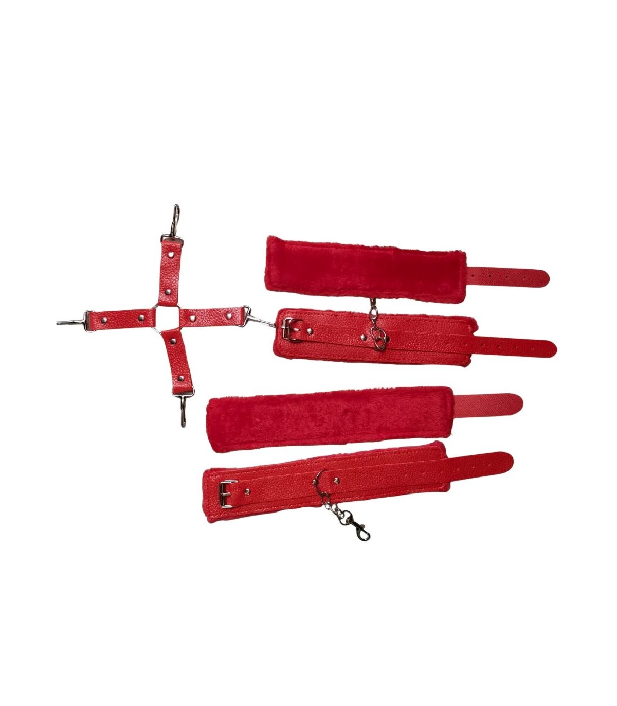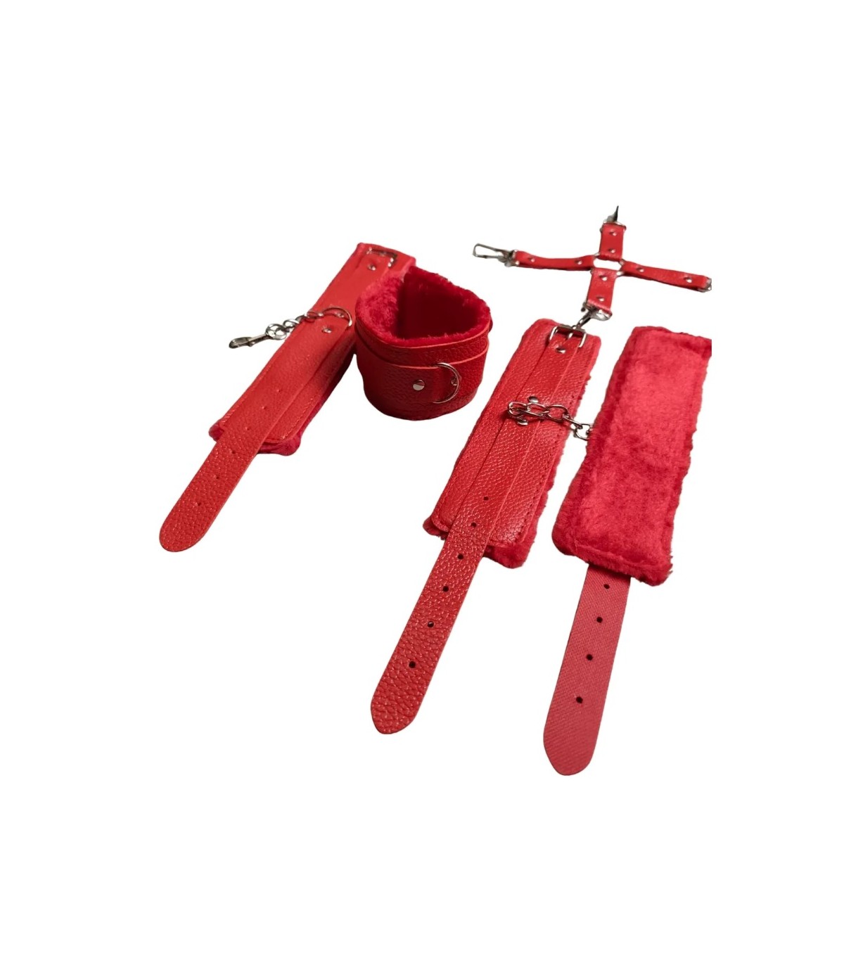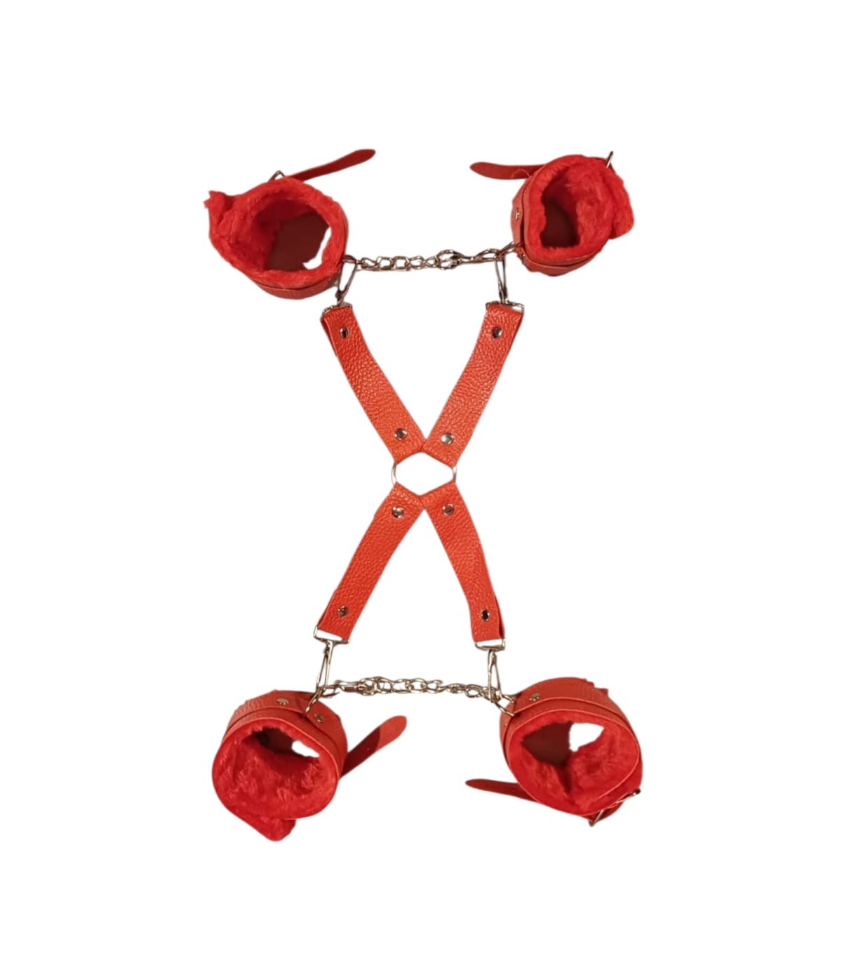 Inmovilizador de muñecas y tobillos unidos con mosquetón, con esposas de tamaño regulable. Confeccionado en cuero ecológico de alta calidad y el interior de suave peluche.