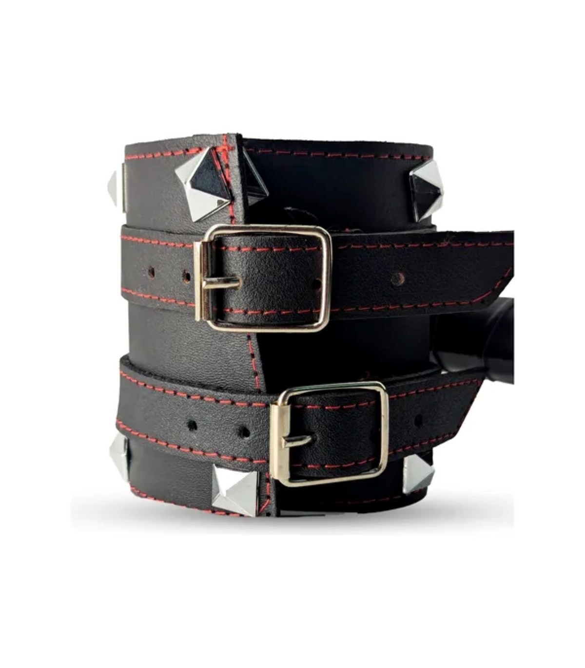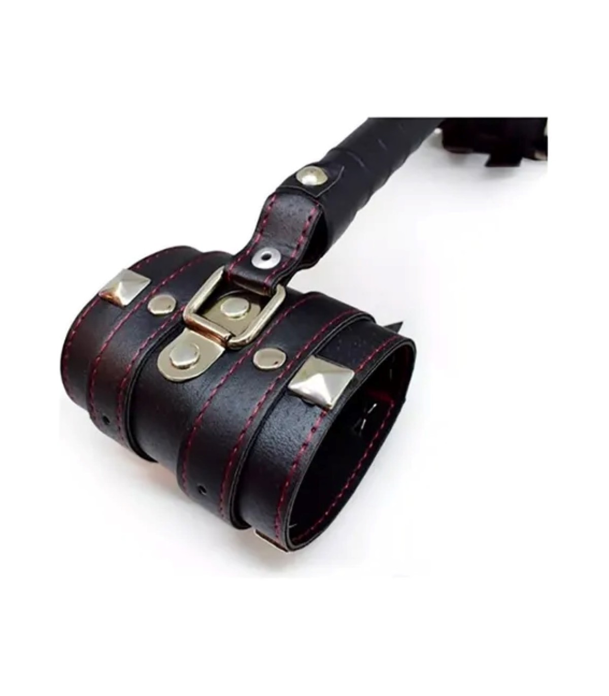 Confeccionada en cuero, con detalles de tachas y costuras rojas.