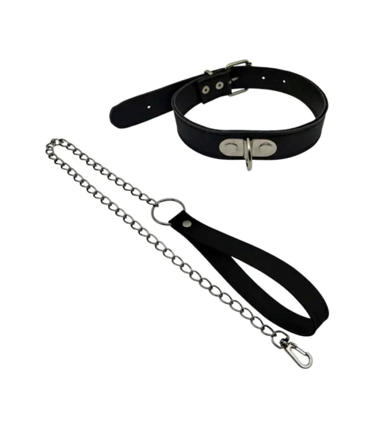 Collar ajustable de cuero negro con cadena de metal. Confeccionado con tachas y materiales de primera calidad.