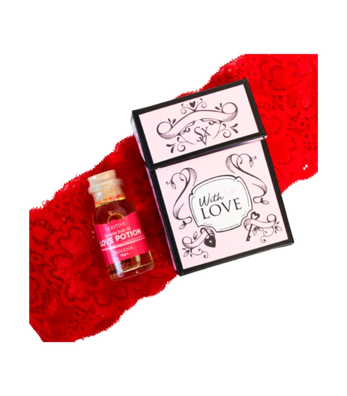 El Love Kit Red incluye un Lazo de Ojos Rojo para intensificar los sentidos y crear un ambiente misterioso, junto con un Mini Aceite Love Potion Sexitive que aporta suavidad y sensualidad para masajes íntimos.