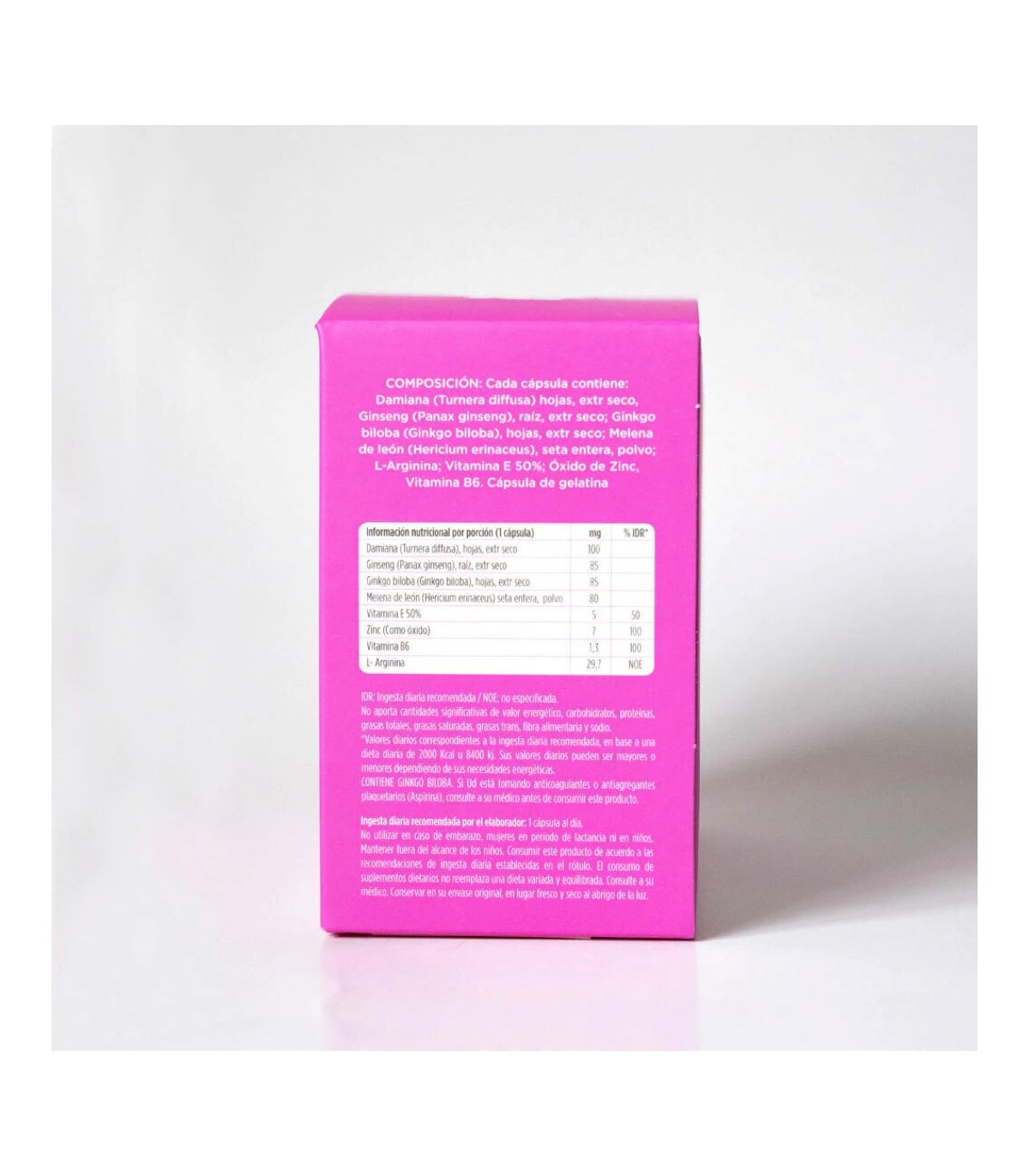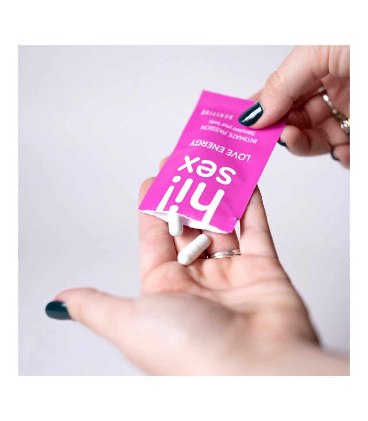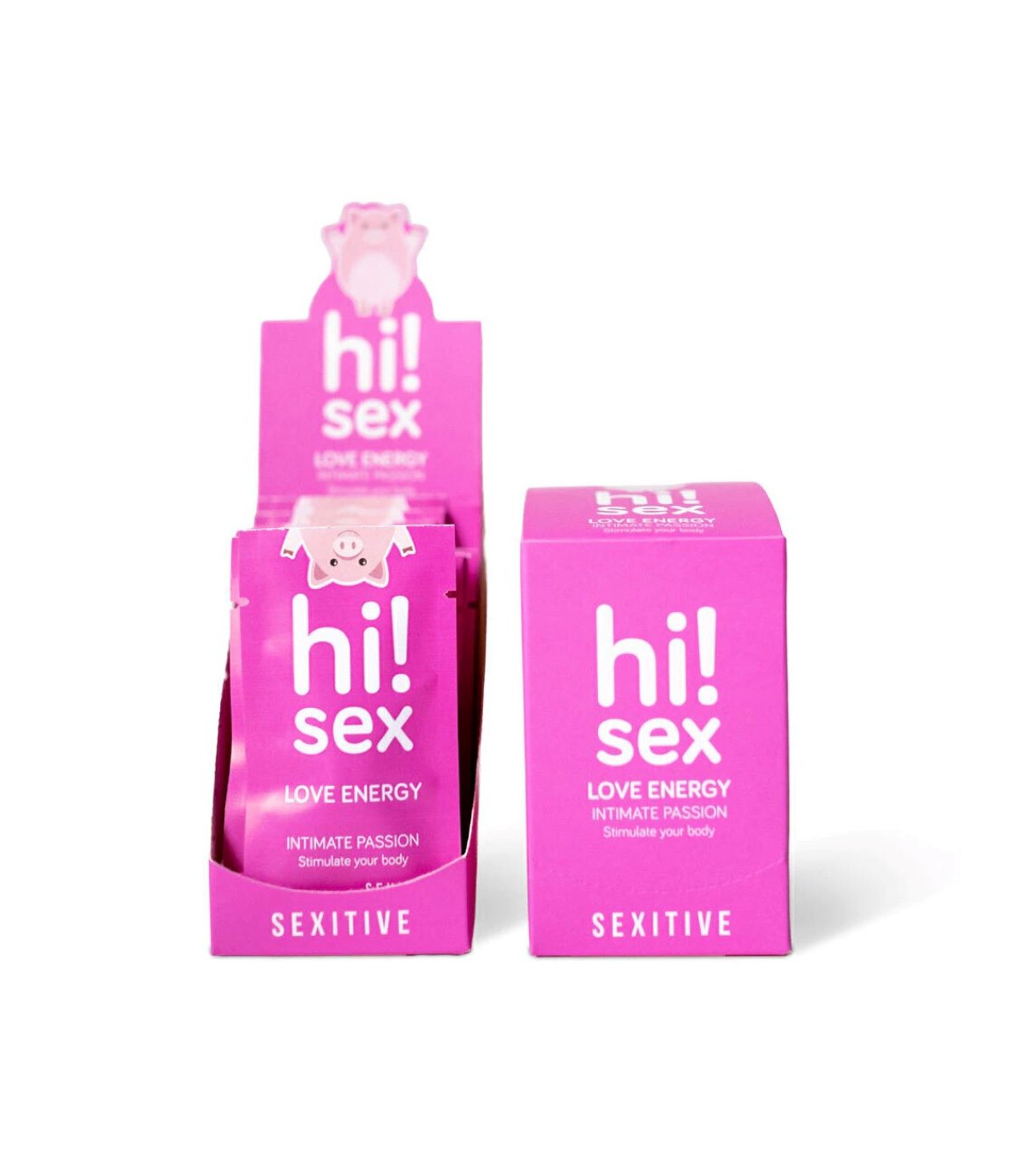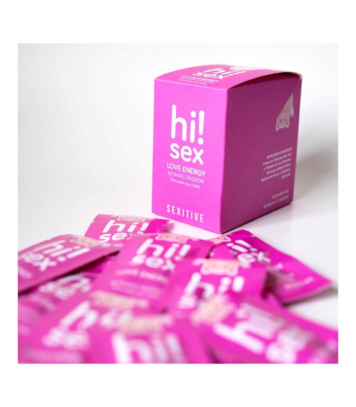 Hi! Sex - Love Energy, un suplemento dietario formulado con vitamina B6, zinc y vitamina E, junto a una poderoso complejo afrodisiaco de ingredientes ancestrales: damiana, ginseng, ginkgo biloba, melena de león y L-arginina. Esta fórmula seductora está diseñada para revitalizar tu cuerpo, potenciar tu energía y mejorar tu desempeño sexual, ayudándote a disfrutar de momentos íntimos más intensos y conectados.