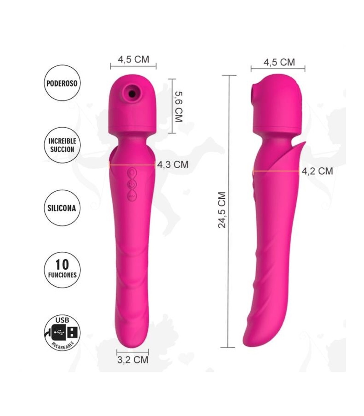 Tiene dos extremos, en uno hay un clásico estimulador de Punto G con 10 modos de vibración, mientras que del otro lado es una combinación de estimulador de clítoris con golpeteos y un succionador de clítoris con 1o modos diferentes.